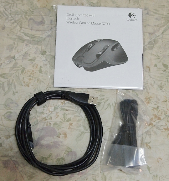 其餘配件很簡單,只有說明書、USB延長線,以及G700專用的USB連接線,前面特色介紹有寫連接線可以用來充電,也可以用來傳輸滑鼠訊號,裝上去就是一隻有線滑鼠,且可以邊用邊充電。現在省到連驅動程式光碟都不附了,真不知道如果家裡剛好沒網路的人是要怎麼下載。