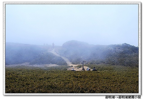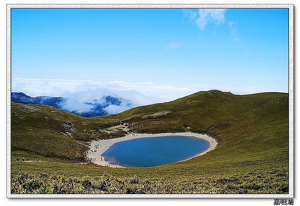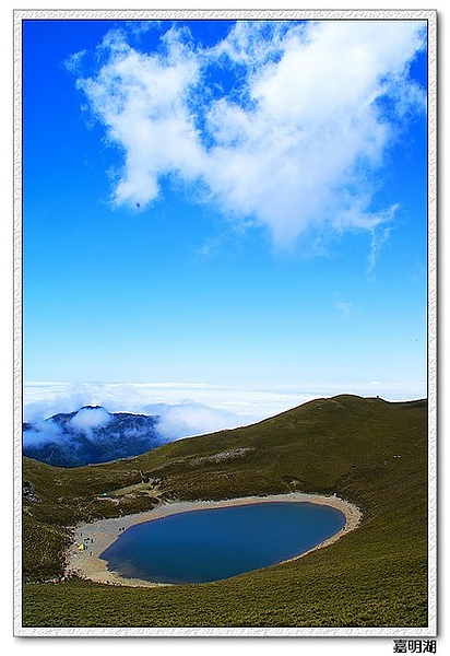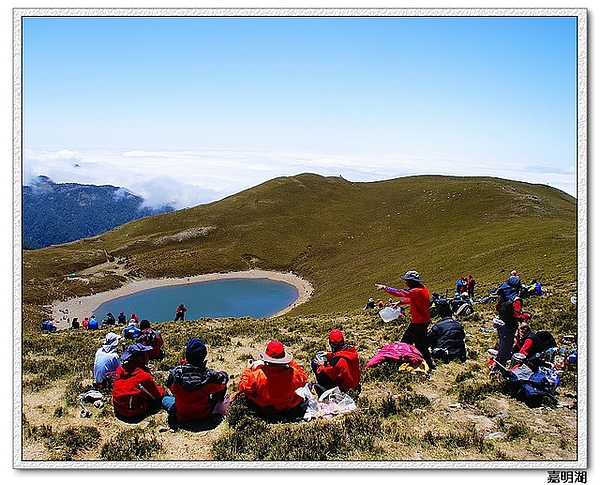 今天有很多隊伍來一親嘉明湖芳澤。由於下到嘉明湖盼還要200公尺,早已精疲力竭的我們,和大部分人一樣選擇坐在山坡上靜靜欣賞這滴天使遺落在人間的眼淚。