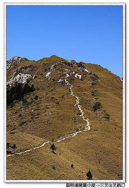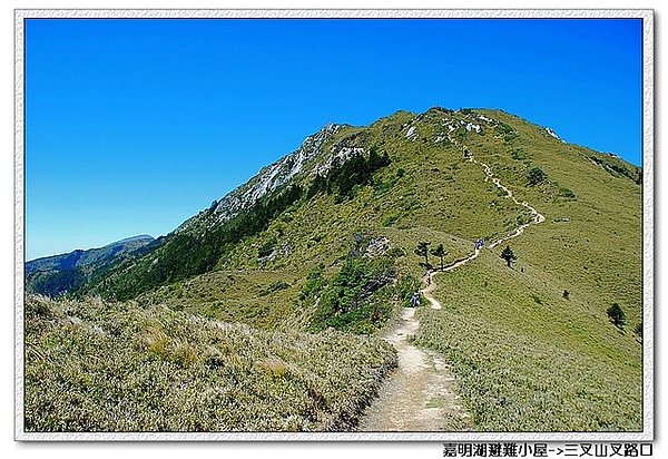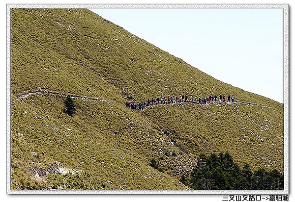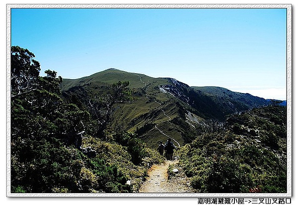 剛過第一個坡時嚮導指引我們遠眺,只見到山徑上上下下蜿蜒在群峰之間,而目標之一的三叉山和嘉明湖叉路口還遠在天邊呢,想到回程還要再走一次,只能苦笑深呼吸一口氣繼續向前走!