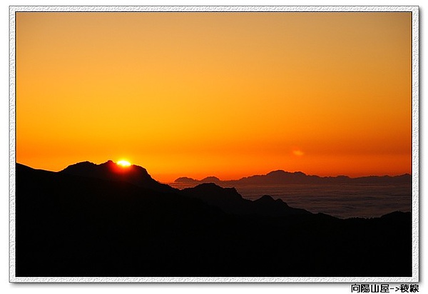接著終於日出了,火紅的太陽一昇起天空立刻由黑轉紅,光芒四射的陽光將周圍群山都照亮了,高聳壯闊的中央山脈和波濤洶湧的雲海相互輝映美不勝收!