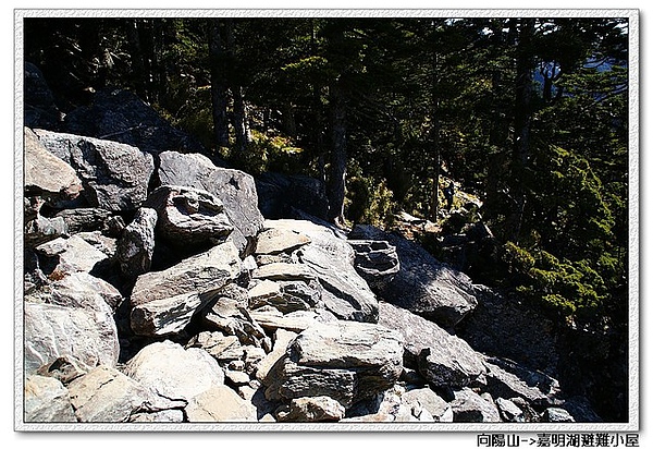 沿路是下坡,接著遇到一條「石頭河」橫擋在前,這是一條從向陽山頂直洩而下,寬約數十公尺全由巨石組成的石頭河流。