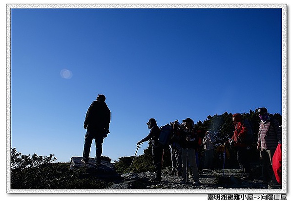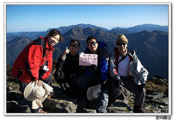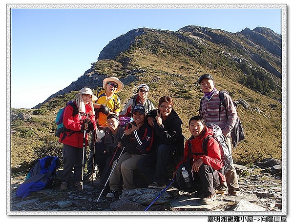 向陽山頂是由許多像人一樣高的大石頭和岩壁組成,在岩壁間手腳並用攀爬約50公尺,最後才能攻上向陽山頂,小強、Ally、建煌、信閔是第一次登上百岳,都相當高興和興奮。
