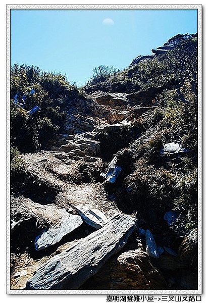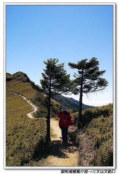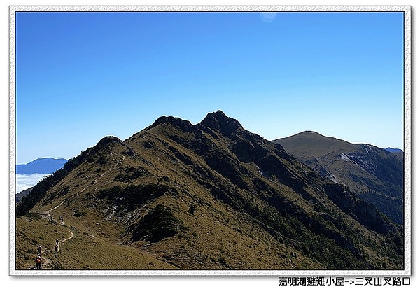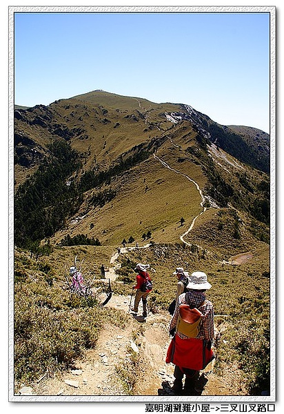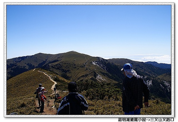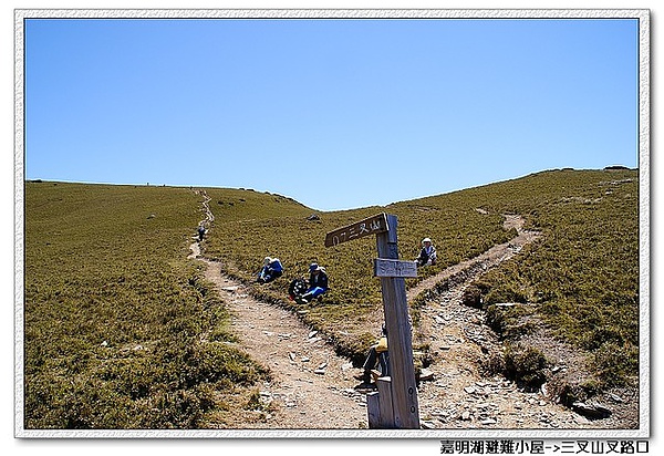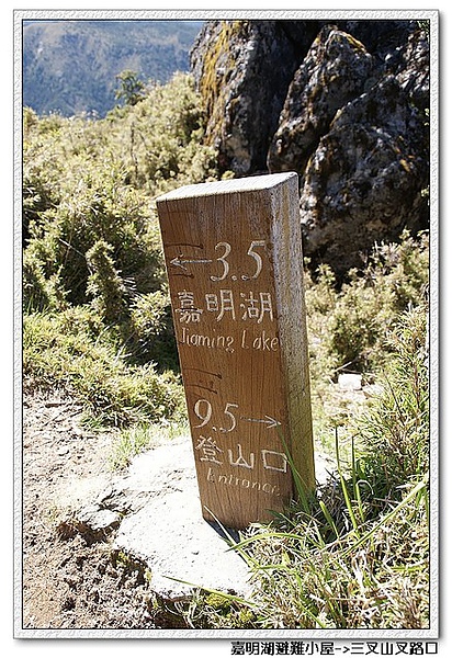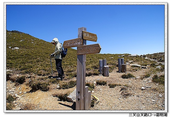 下了向陽哭坡,兩個半小時後終於到達三叉山叉路口,我們主要目標在嘉明湖,所以部分人向三叉山攻頂,部分人則直取嘉明湖。