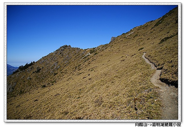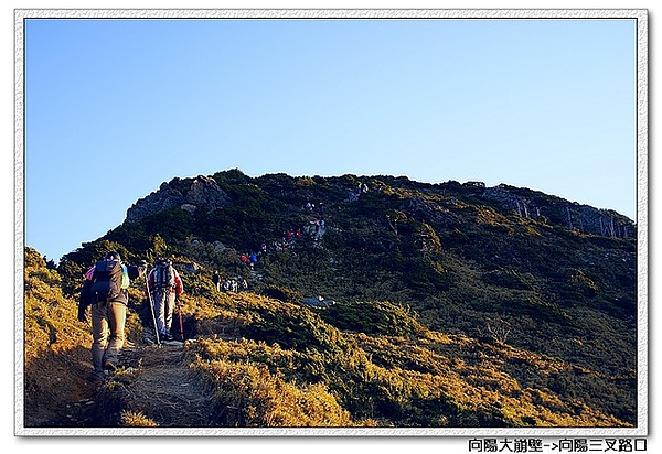 好不容易終於上到最後一個坡,之後會突然陡下約三百公尺,由於眼前沒有更高的山,加上地形陡峭路徑狹窄,下坡時頗令人心驚膽跳。這個最難走的坡由於高度高又難走,被戲稱「向陽哭坡」,意思是會讓人走到想哭。