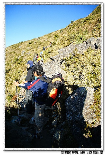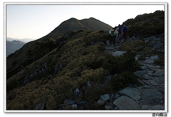 從向陽山屋上到稜線是之字形上坡,要重裝爬升約300公尺,因為是摸黑行走,大家都裝上頭燈一個接一個走,好似人工螢火蟲般。
