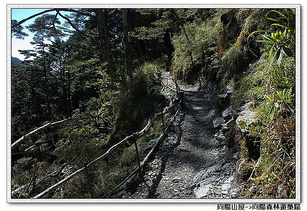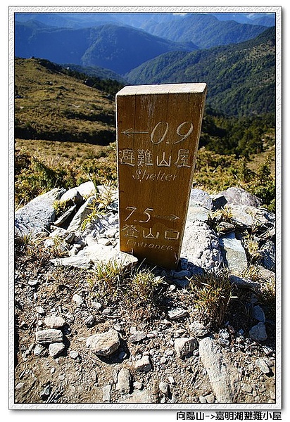 下山後要腰繞向陽山繼續往嘉明湖避難小屋前進,距離三叉路口約0.9K。
