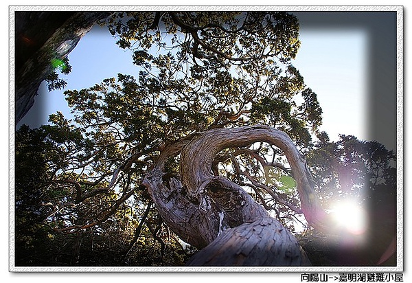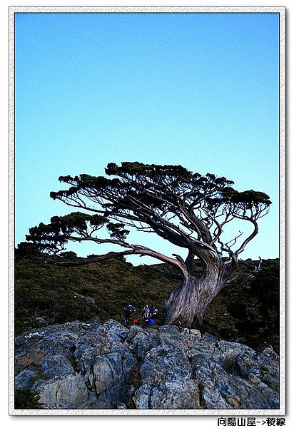 在稜線上會先遇到一棵名樹「玉山圓柏」,由於山上長年吹風,迎風面雖然被風吹得歪向一邊像個駝背老翁,但百年來仍鶴立雞群傲然挺立。