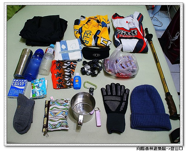 裝備檢整:長、短排汗衣*1、鋼杯、筷子、毛帽、手套、風衣、保暖衣、登山杖、頭燈、巧克力、防曬油、盥洗用具、太陽眼鏡、保溫瓶、運動水壺、電池、MP3、厚襪子、遮陽帽、雨褲、鞋套、個人藥品、毛巾...