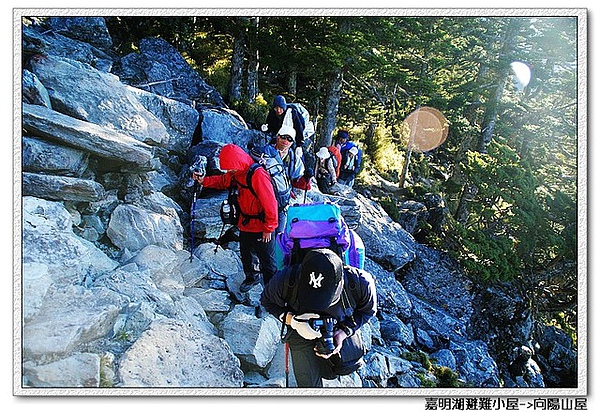 休息後大家拿出小背包換成輕裝,因為今晚我們要住在避難小屋,所以只需輕裝往返嘉明湖。九點左右我們啟程往嘉明湖,嘉明湖距離避難小屋約4.5 km,先走過一段松樹林後,眼前就是此行最難走的一段路,著名的嘉明湖「三上三下」,也就是要連續上坡、下坡三次才能到達嘉明湖。