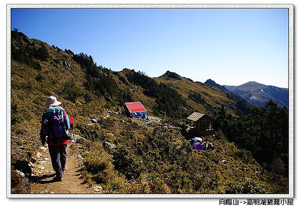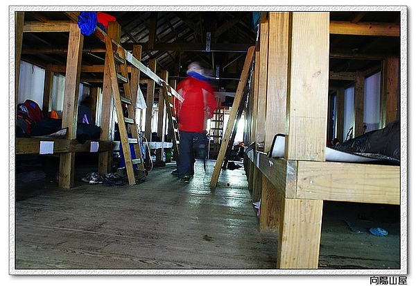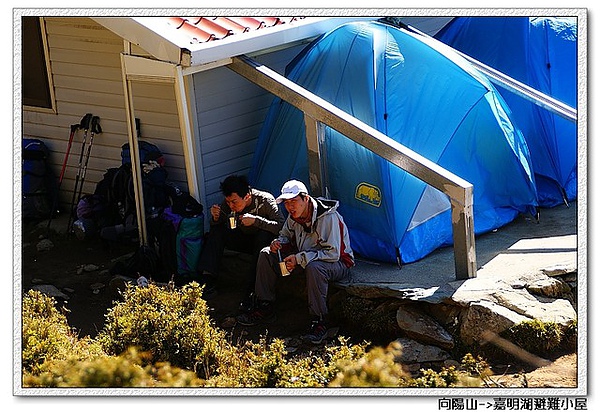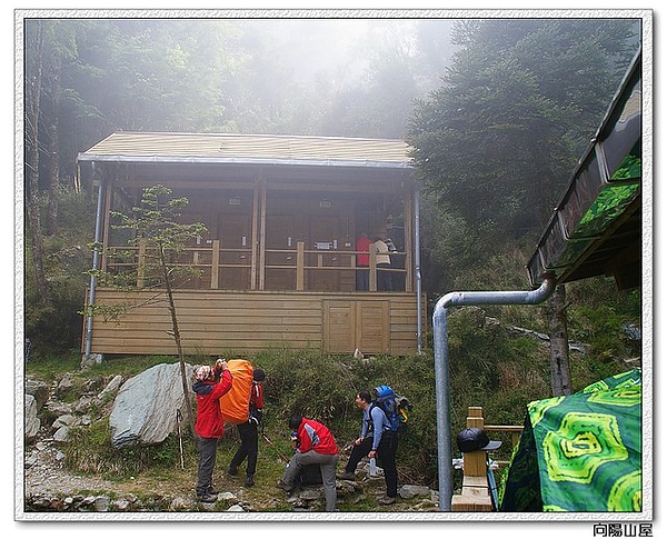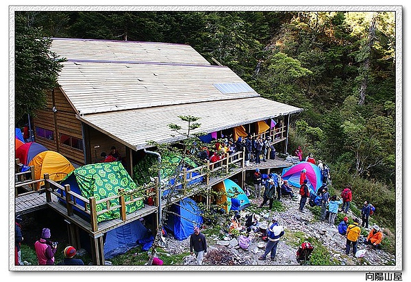 兩個半小時後抵達向陽山屋,這星期是登嘉明湖的大熱門時段,山屋內100個床位被佔滿不說,外面走廊,甚至挑高而建的山屋下層也全被露營帳棚佔據,可說熱鬧非凡。