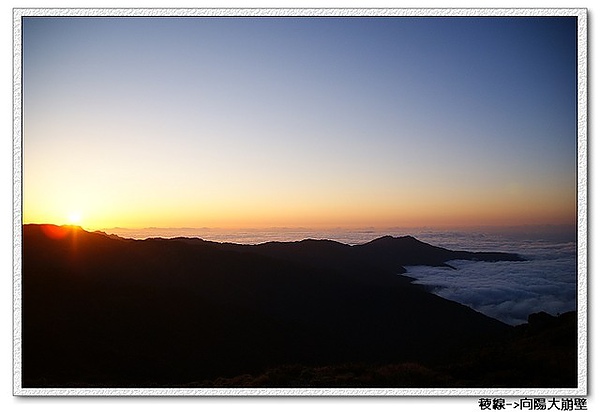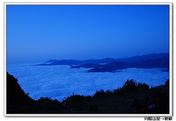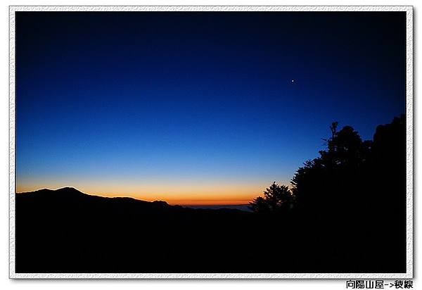 凌晨四點半終於上到了稜線,這時天空由下而上呈現橘黃->白->藍->黑的漸層色,美得令人驚豔。