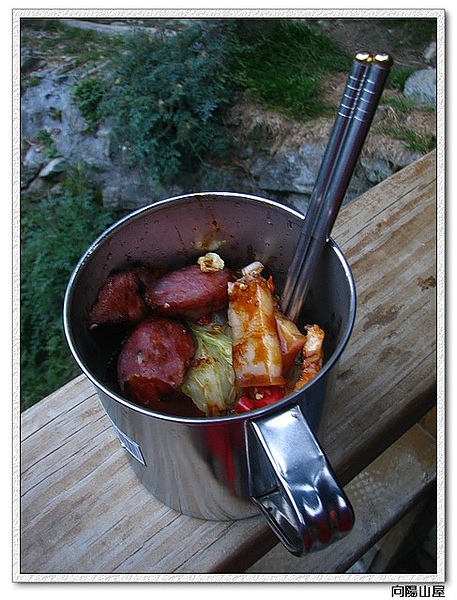 稍事休息並整理好帳棚、裝備後,下午五點就開飯了,能在山裡面吃到白飯、炒青菜、山豬肉、香腸...全靠挑夫和嚮導們的協助,靠我們自己大概只能吃泡麵吧。